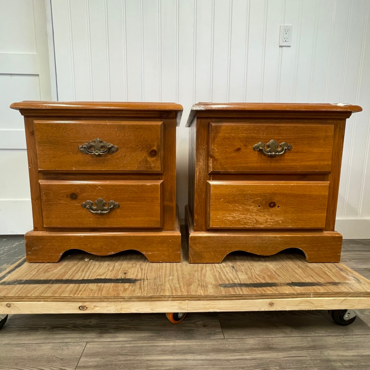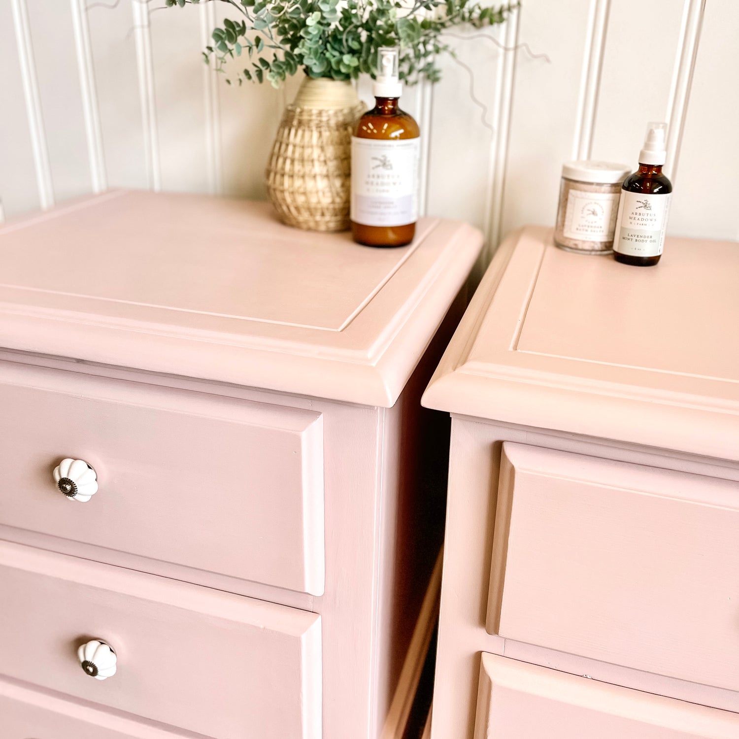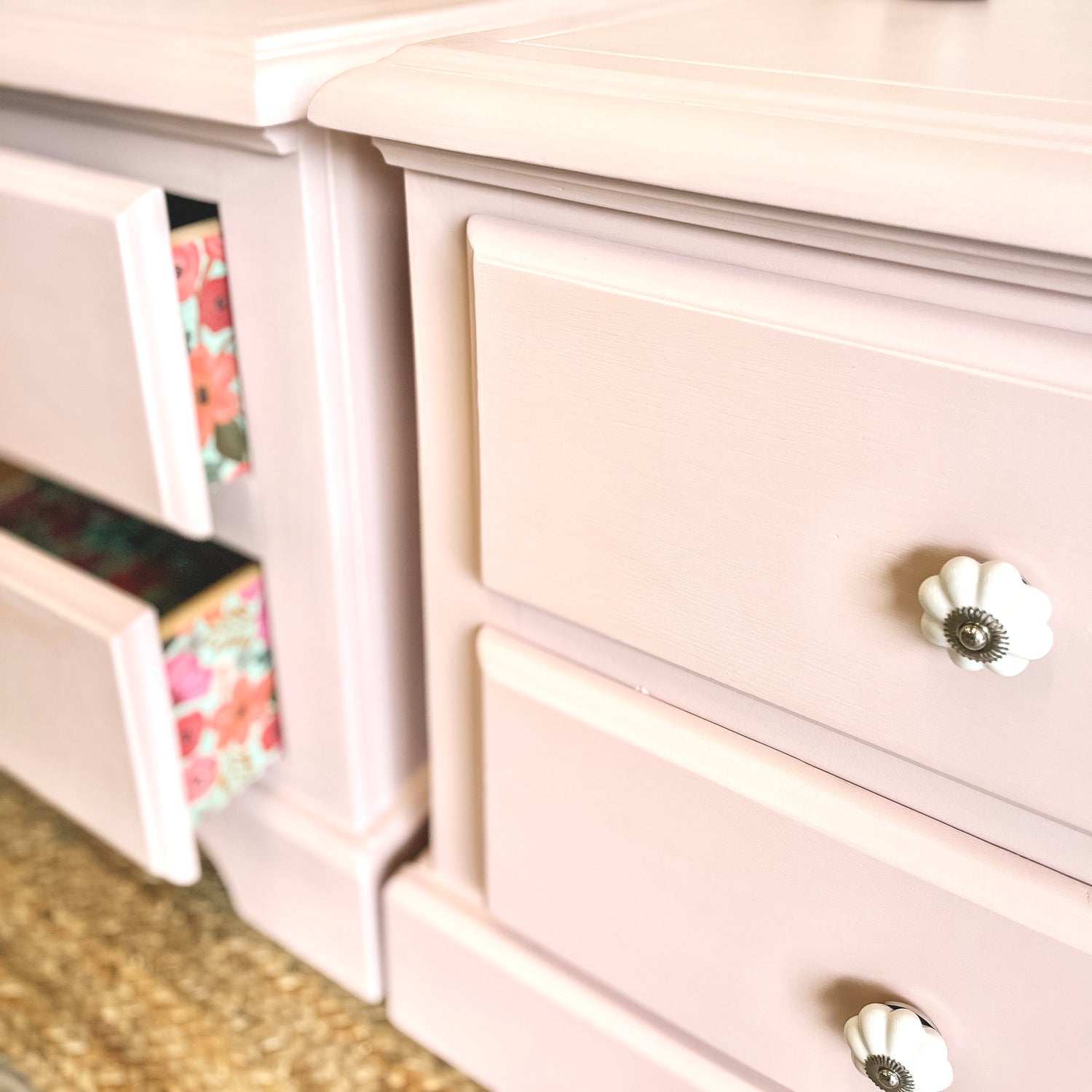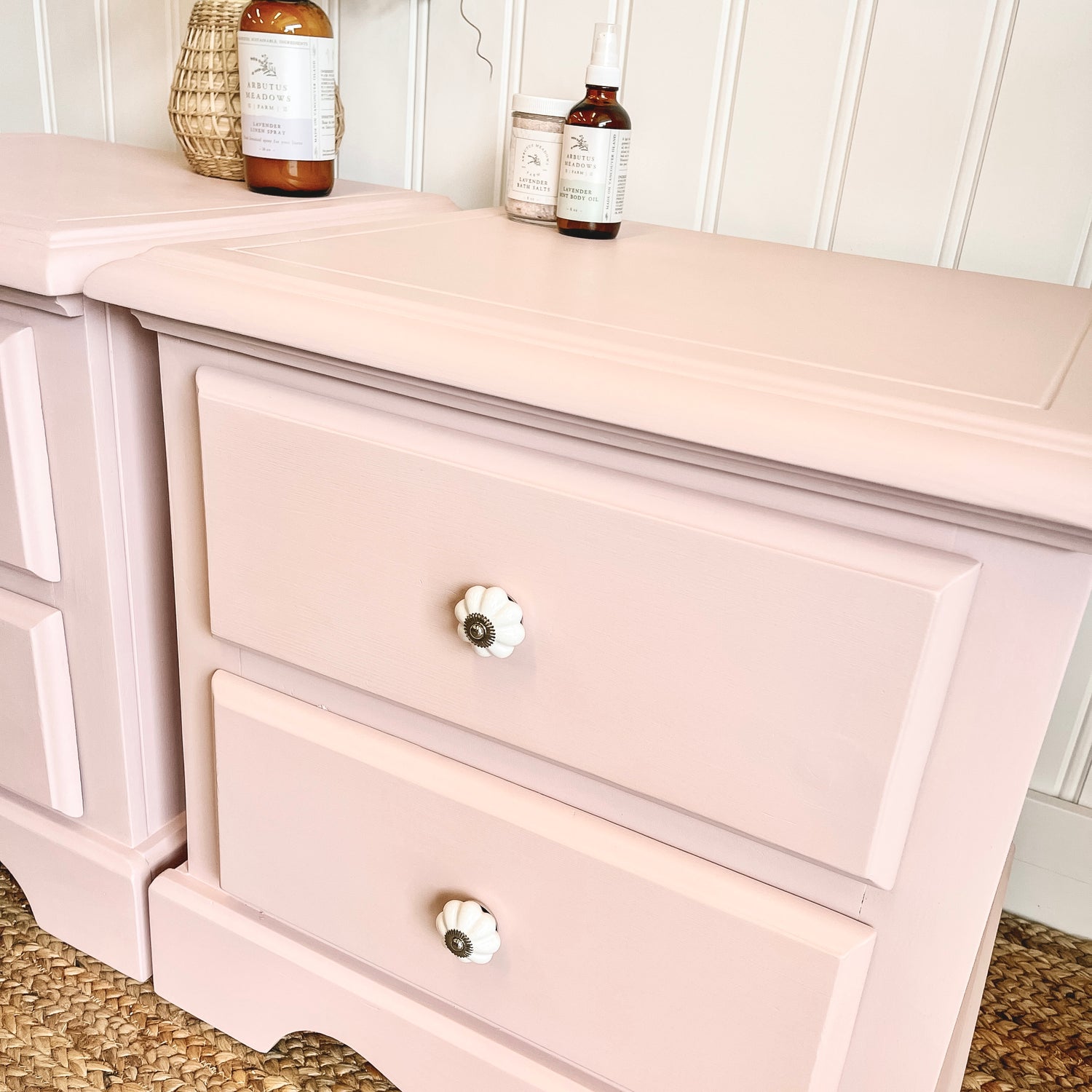 These solid wood 2 drawer bedside tables have been lovingly re-imagined using (3) coats of Rose Water by Fusion Mineral Paint ..