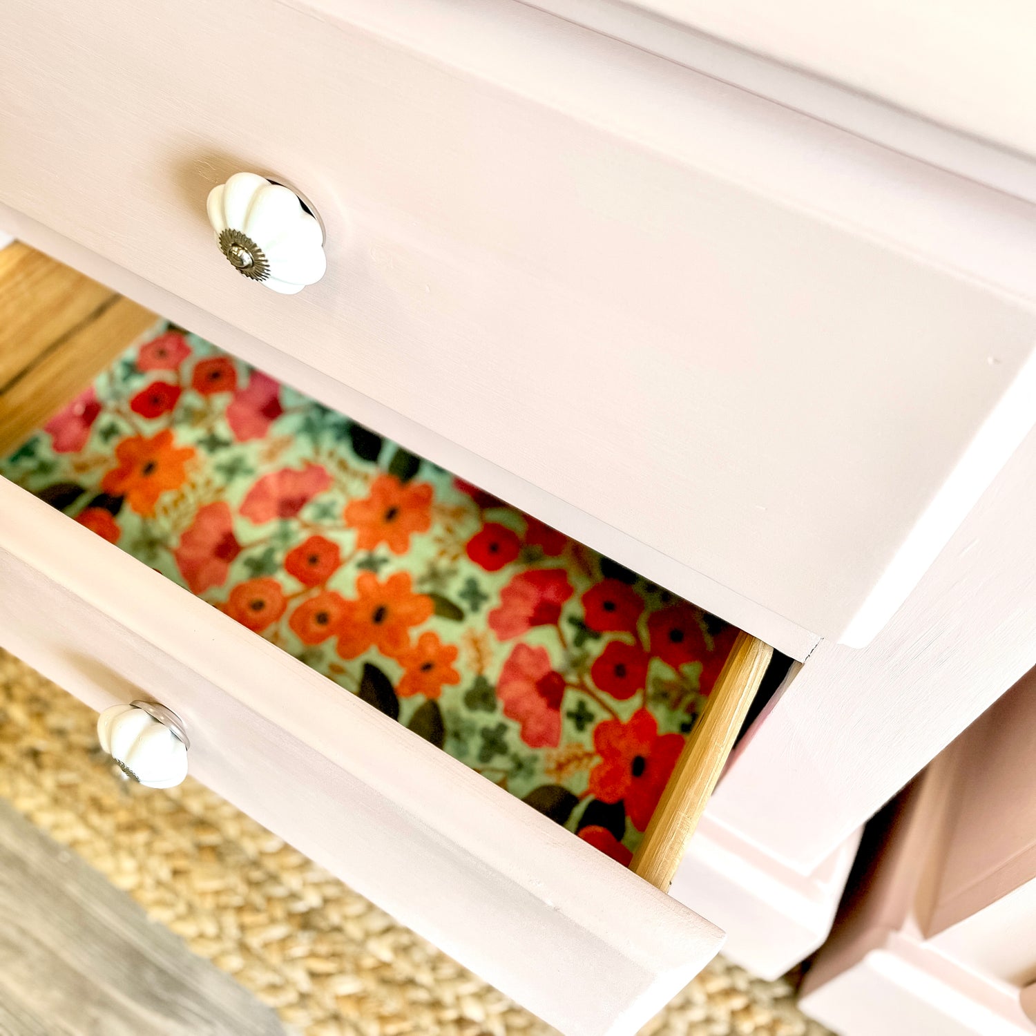 The exterior sides, and inside bottom, of both drawers have been decoupaged with a bold floral patterned tissue paper to add a fun finishing touch …