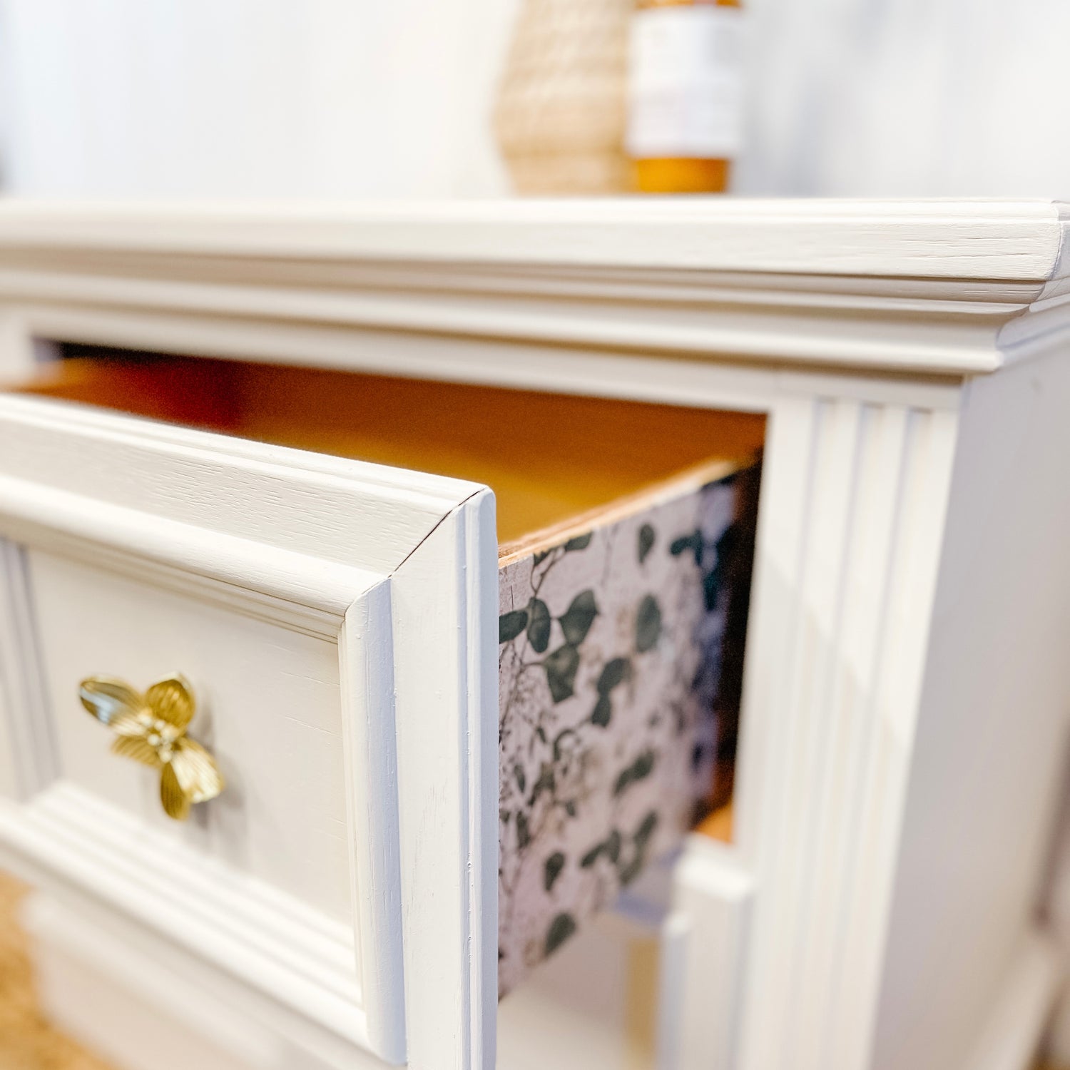 The exterior sides of both drawers have been decoupaged with a delicate patterned tissue paper to add a thoughtful finishing touch …