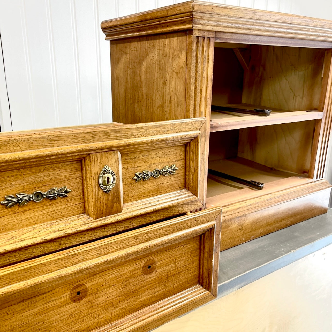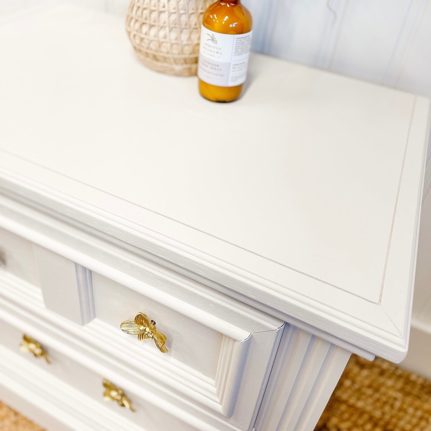 A finishing coat of Clear Furniture Wax was added prior to putting gorgeous new gold floral drawer pulls on to this beautiful piece !