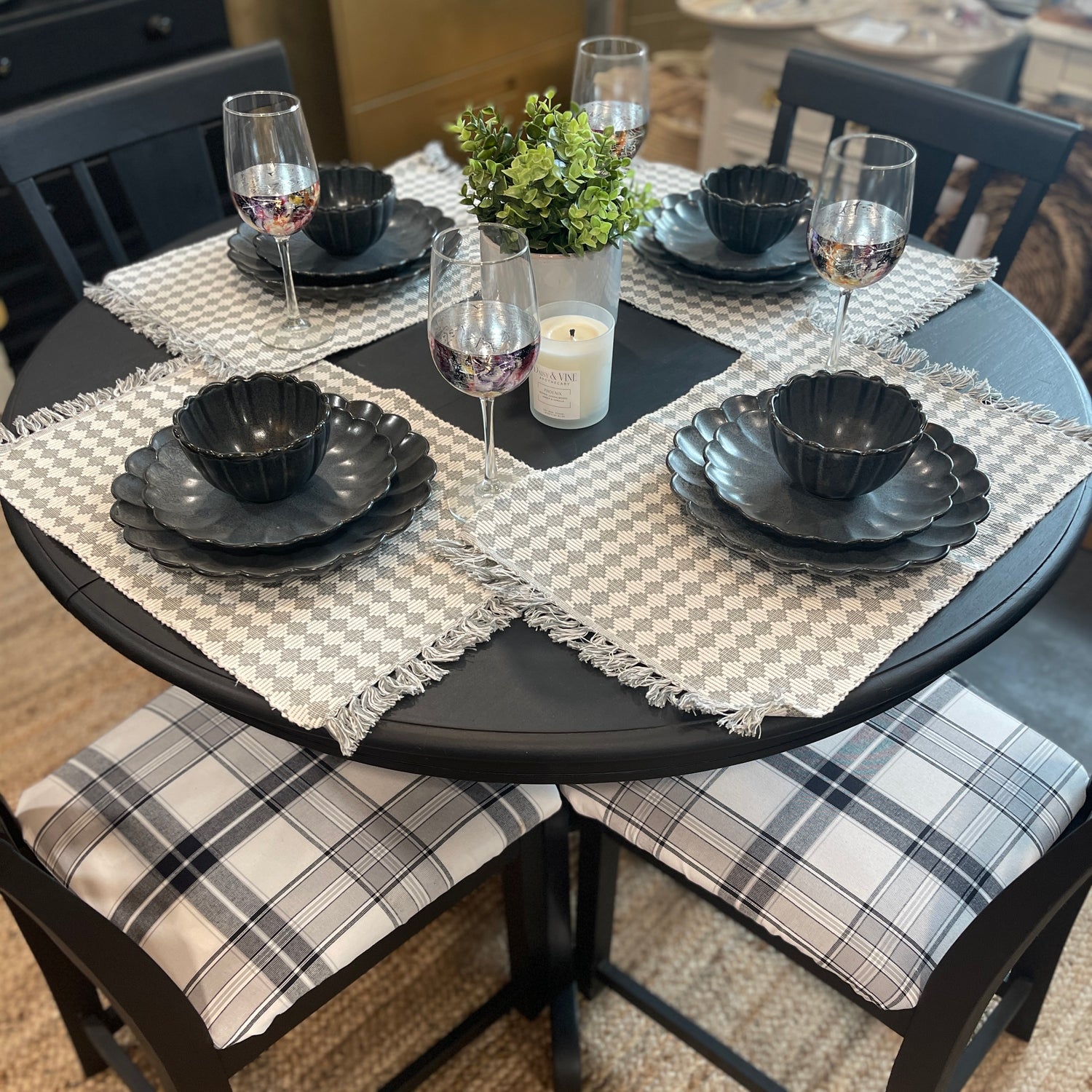 The cloth chairs have been recovered with a beautiful white and black large checked material !