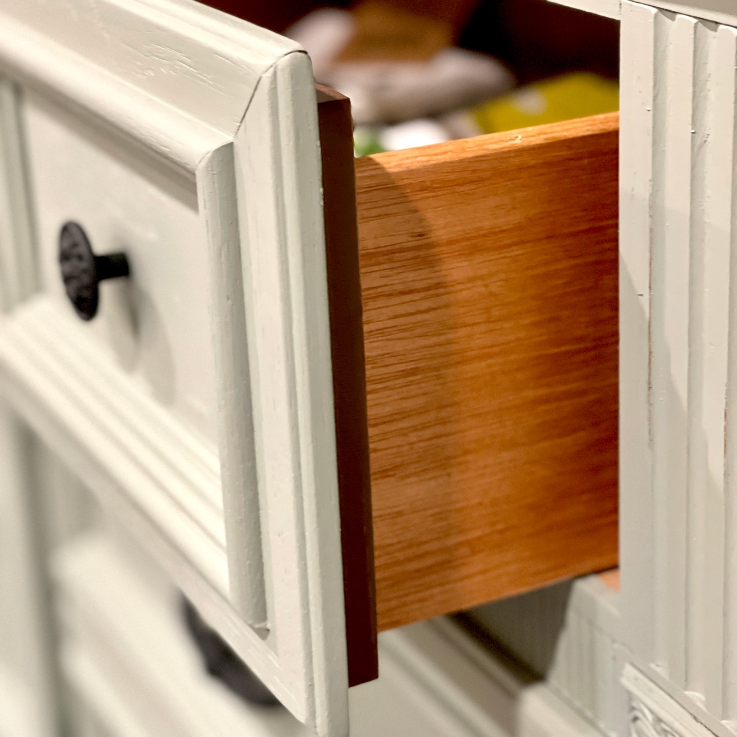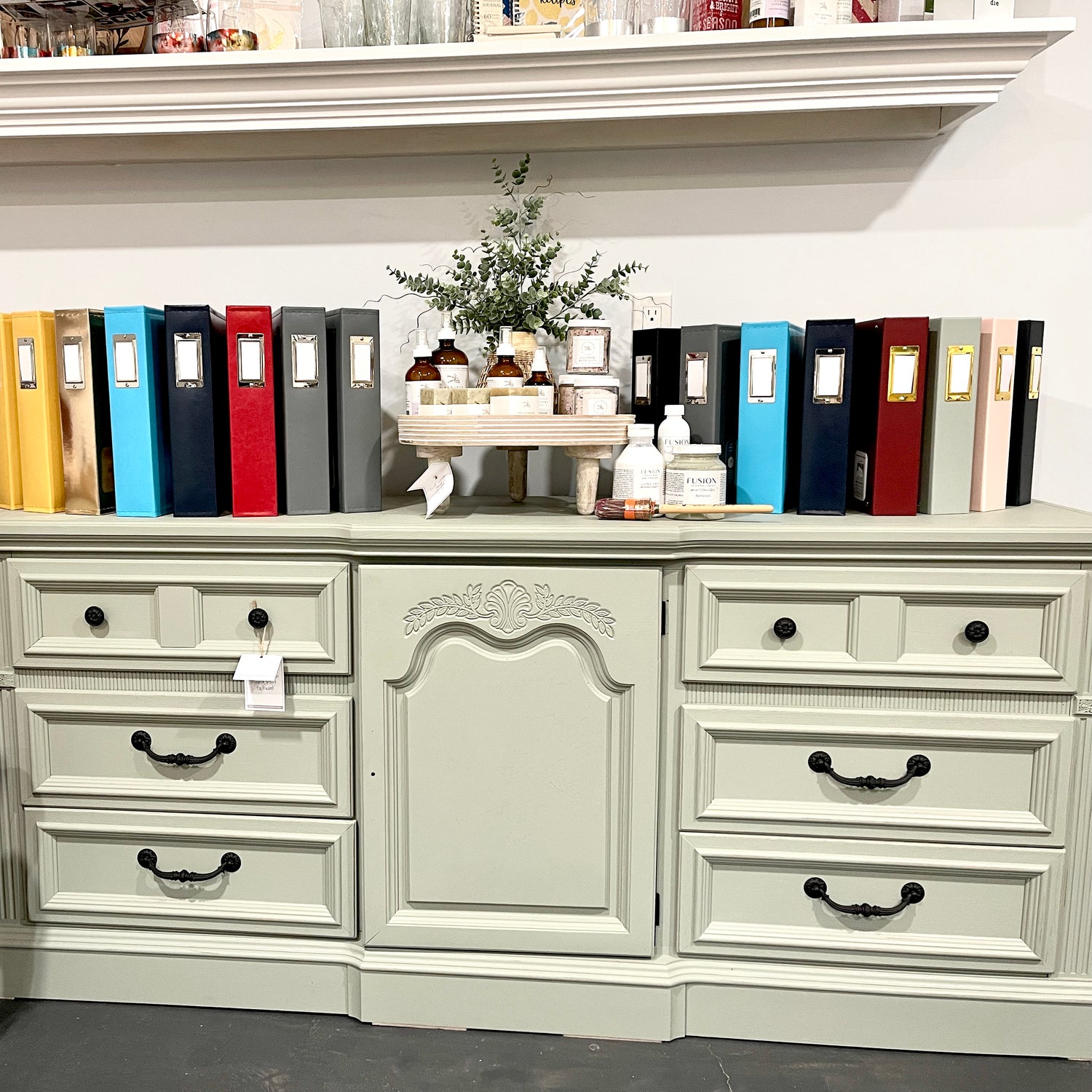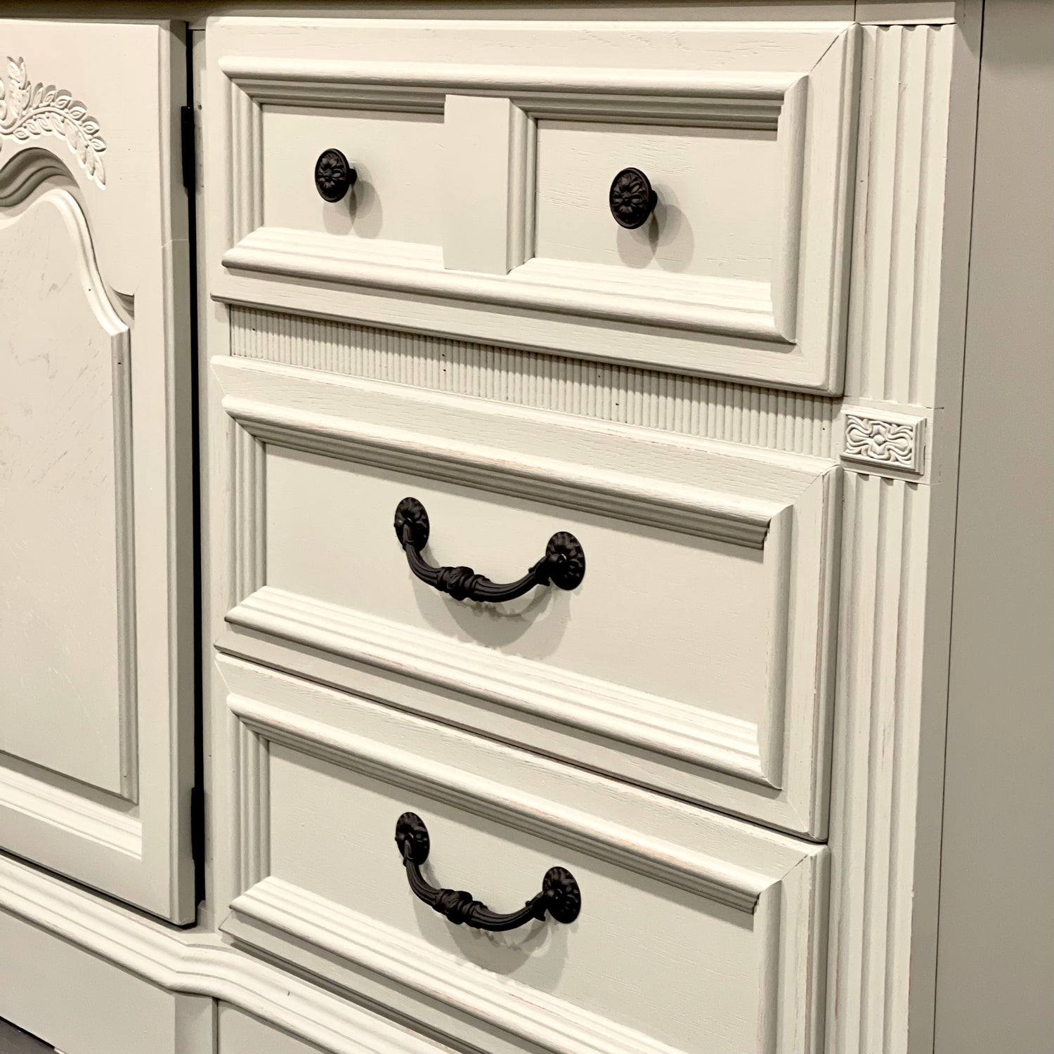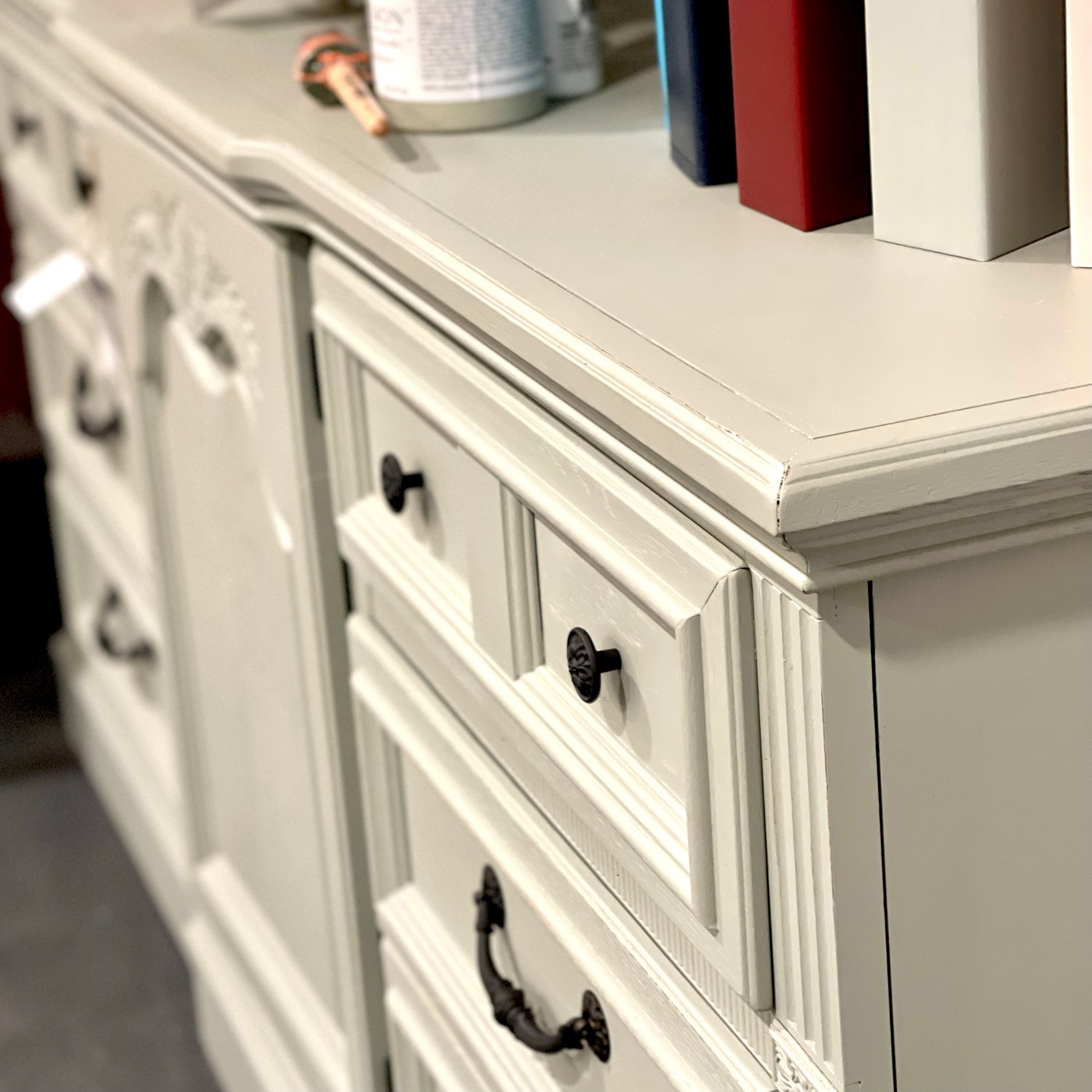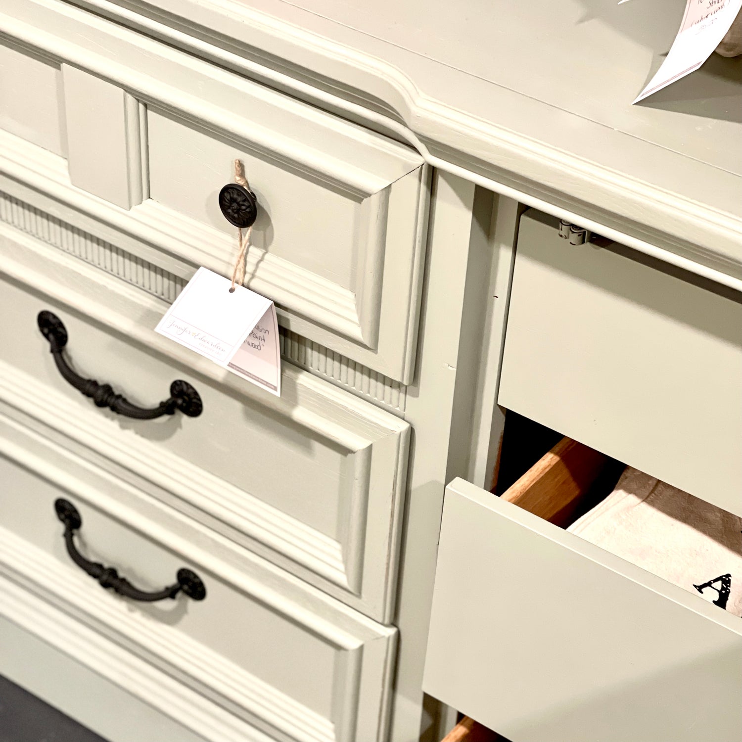 This piece has been carefully and lovingly re-imagined with Fusion Mineral Paint in the Color Bellwood … and the original hardware has been kept to keep with the age if the piece, but cleaned and spray painted matte black !