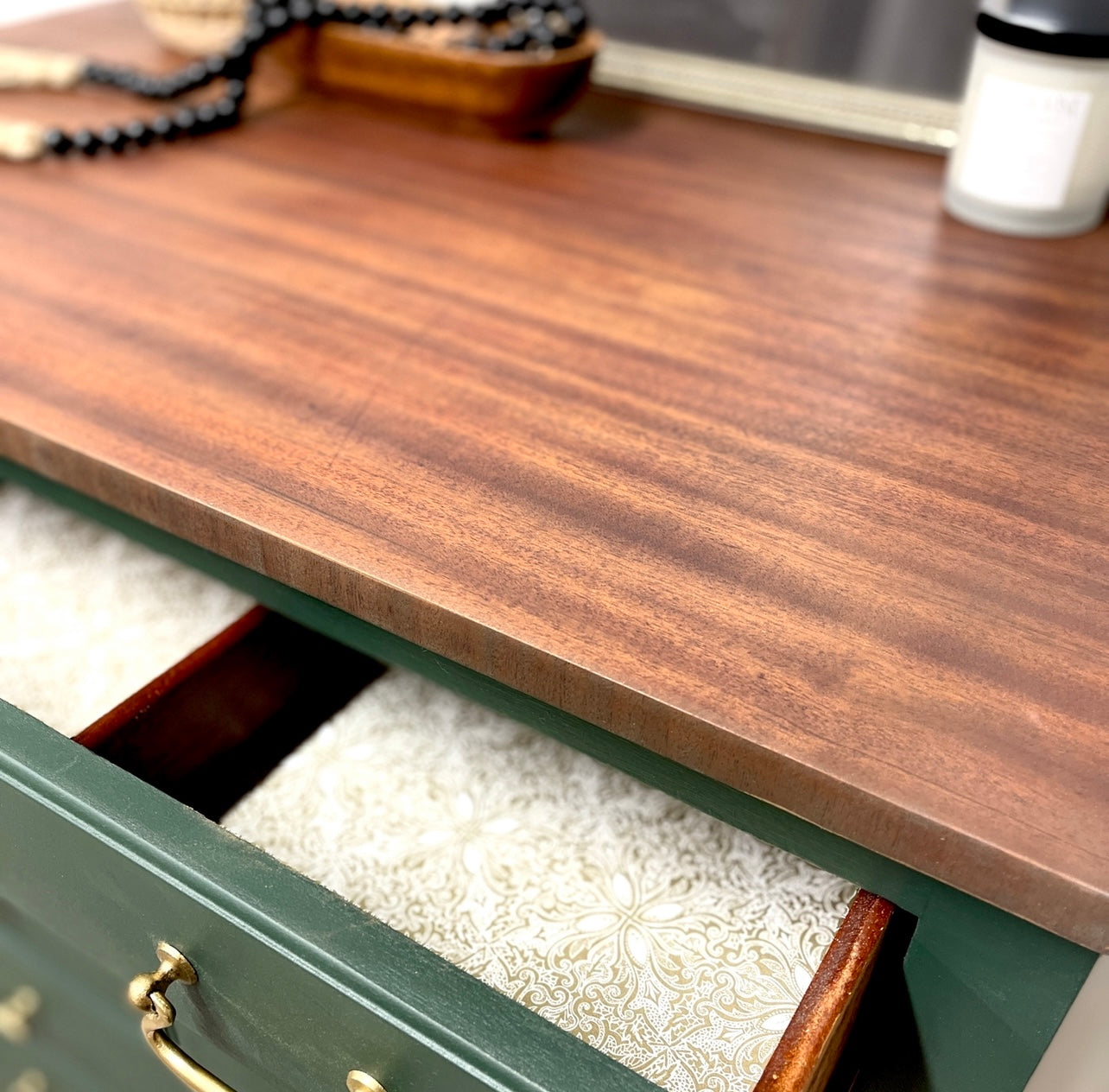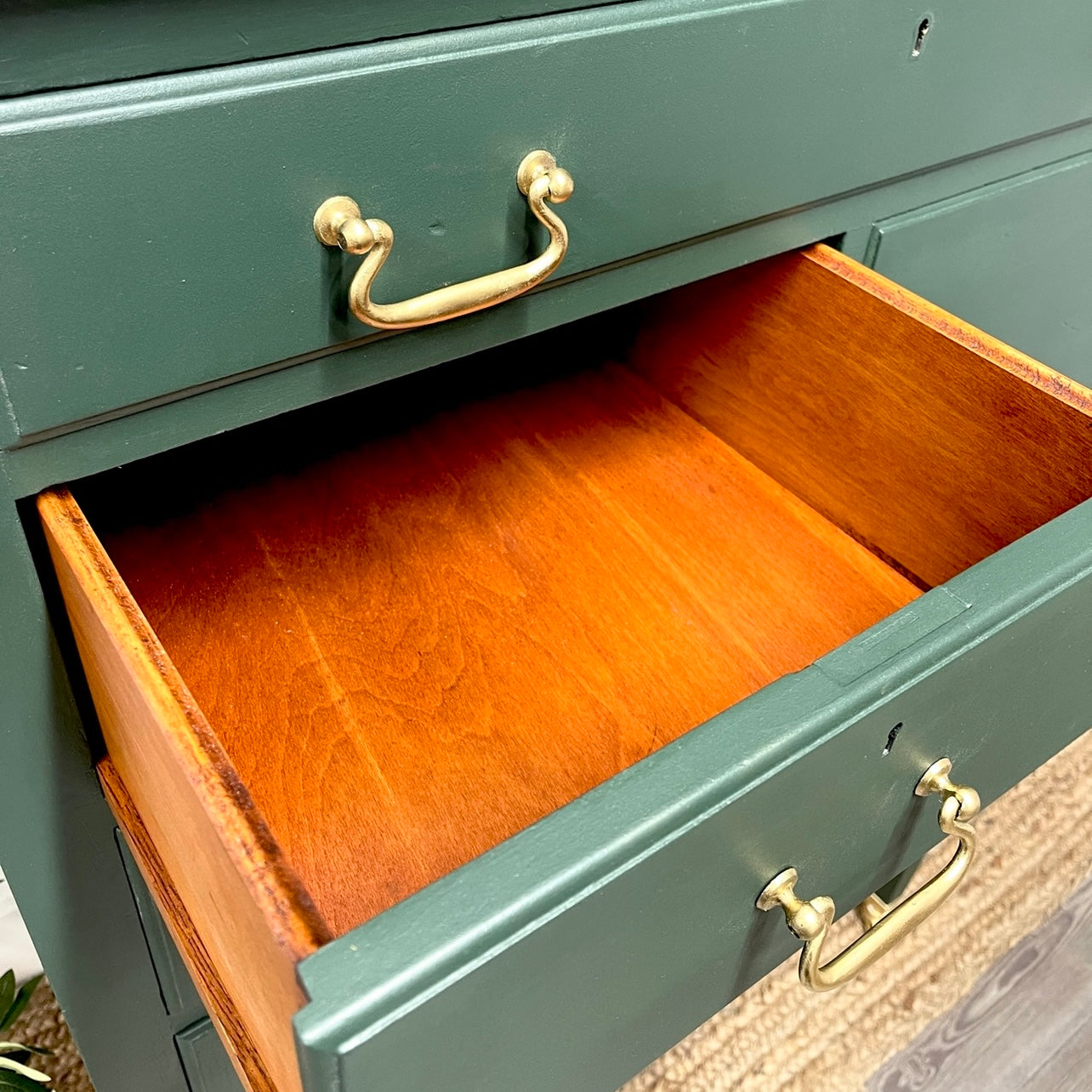 The top drawer had a little damage inside, so was lined … and the others were conditioned with a Beewax finish to the original wood.